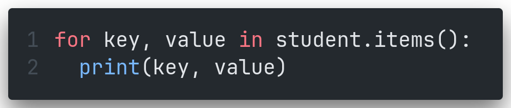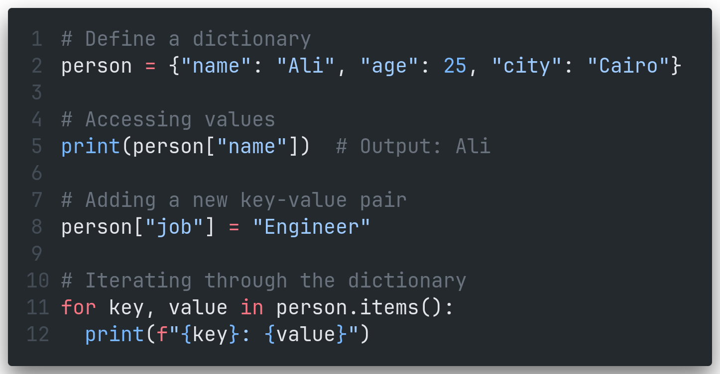 - Iterating Over Items: Iterating through keys, values, or both using loops.