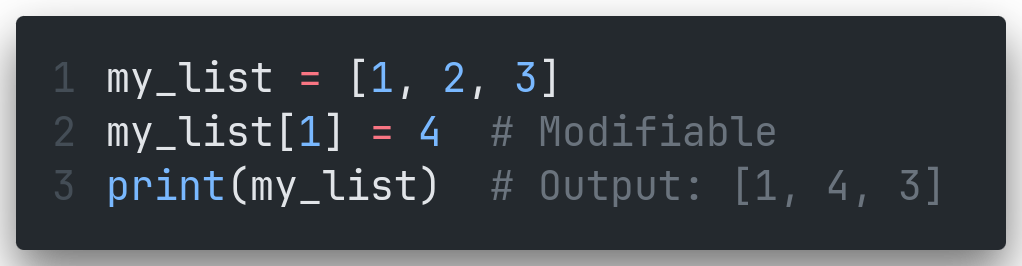 | Mutability | Mutable (items can be added, removed, or changed). | Immutable (items cannot be modified once defined). |