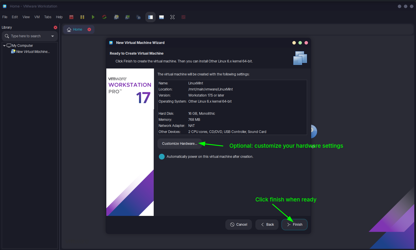 - Click "Finish" to create the VM, then "Power On" to install the OS.