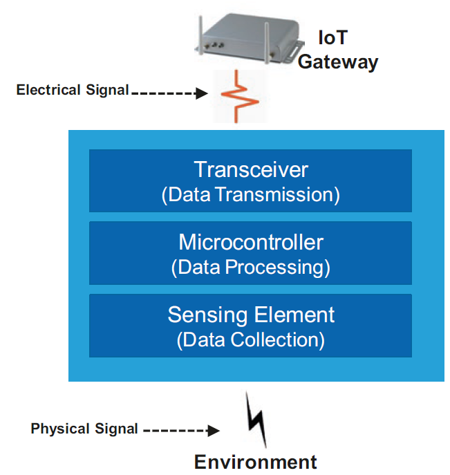 Smart sensors collect and transmit data and only notify the IoT gateway when specific conditions are met. An IoT sensing device requires at least three elements: