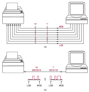 Serial transmission: There is only one single line transmitting all bits, they move one-by-one.