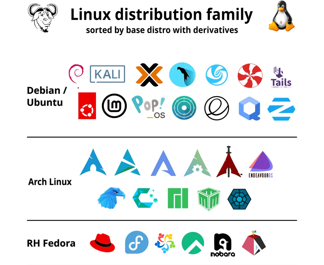 Examples: Ubuntu, Mint, Fedora, Arch, Debian