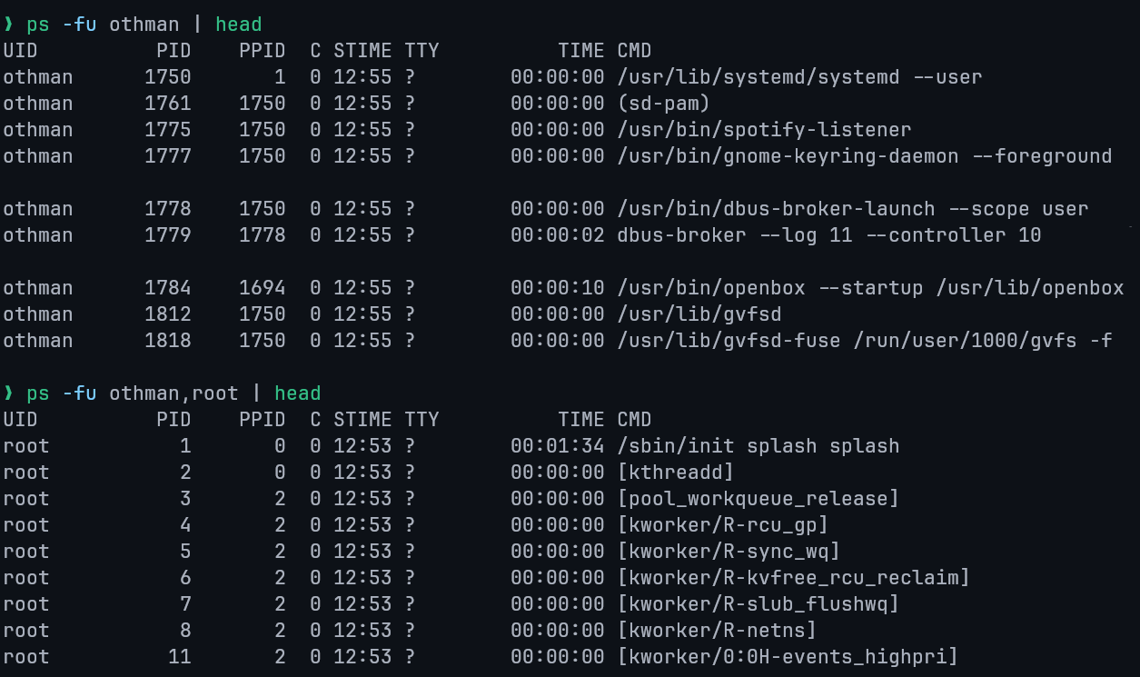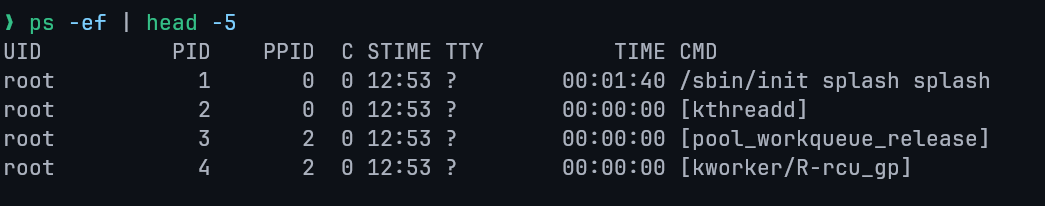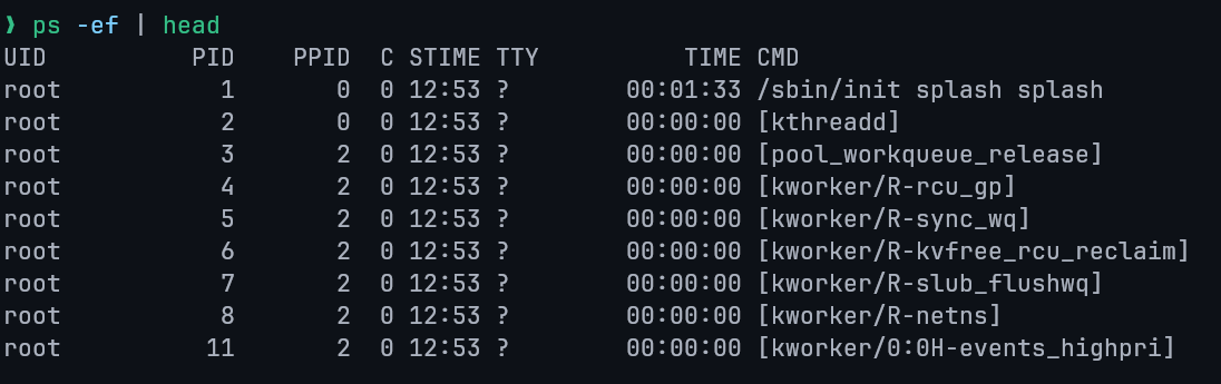UID: The User ID of the process owner.PID: The unique Process ID.PPID: The Parent Process ID.C: The CPU utilization of the process.STIME: The time the process started.TTY: The terminal type where the command is running.TIME: The cumulative CPU time used by the process.CMD: The command that initiated the process.