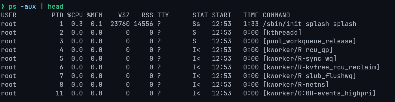 a: Shows information about all usersx: Shows information about processes without terminals (e.g. system daemons)u: Displays the output in a user-oriented format, which includes columns like%CPUand%MEM.