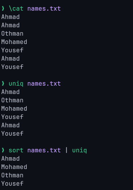 The uniq command removes duplicate lines from a file's content. A critical limitation is that it can only remove adjacent (continuous) duplicate lines.