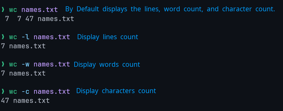 The wc (word count) command counts the number of lines, words, and characters in its input.