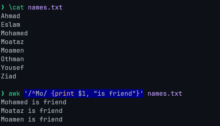 Searches for any line starting with "Mo", prints it and the words "is friend".