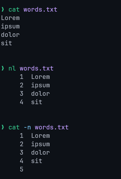 The nl command is used to add line numbers to text data. Similar output to cat -n command.