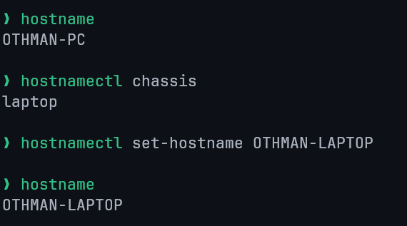 The hostname command displays the system's current hostname.