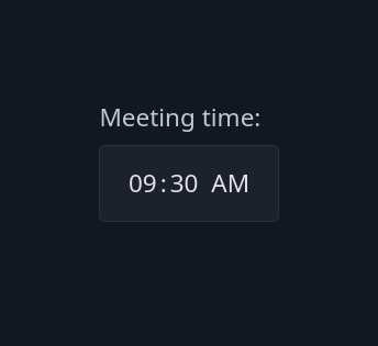 <label>Meeting time:</label> <input type="time" name="meeting" value="09:30" />- Returns value in