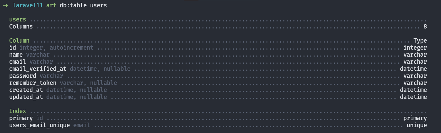 art db:show --database=db_type => Shows info about specific database, useful when having multiple db connections. db type can be MySQL, SQLite, etc.